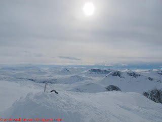I climbed this in an ocean of stratugis all the way to the summit ridge where I met a ten meter 70 degree step in sugar snow where I was really glad I have brought two ice axes for the short climb. After this I stood at the top, happy just to be out, by my self in this wonderful location. It felt like a soulful way of ending my stay up in the north.