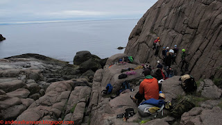 A climber struggling up the most famous pitch (Slanting corner 6) on the most famous route (Vestpillaren) on the most famous crag (Presten) in Lofoten.