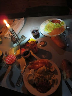 Our awesome dinner: Red vine, fresh tortellini, smoked salmon, mozzarella, tomato sauce, baguette with some compte and candy, dark chocolate and honey waffles for dessert.