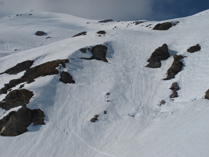 Then I had planned to do more stuff further east in the chain, but it was extremely warm and I didn’t want to climb any more steep stuff on south faces so I went for Mt Buet instead with the intention to ski the north face there. But when I got there I was in the middle of a big cloud and I could hardly see anything so I changed my plan again and went for the south face which I had never skied before. And what a good choice that was; 10 cm of corn with almost no other tracks visible on the skiers left side variation – all the way down to the Berard valley. It turned out to be one of my best skis for the season!