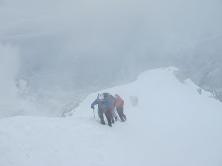 Mike, Morgan and Tobias coming out of the fog after some intense whiteout navigation