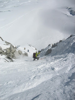 We were chatting the whole way down and I remember Rémy cursing my kick turns and arguing how I should use the double pole plant technique in my skiing. At the mixed section further down we all got quiet, concentrating while down climbing the rocky passage with skis on. At the bottom we shock hands and said we should do it again sometime.