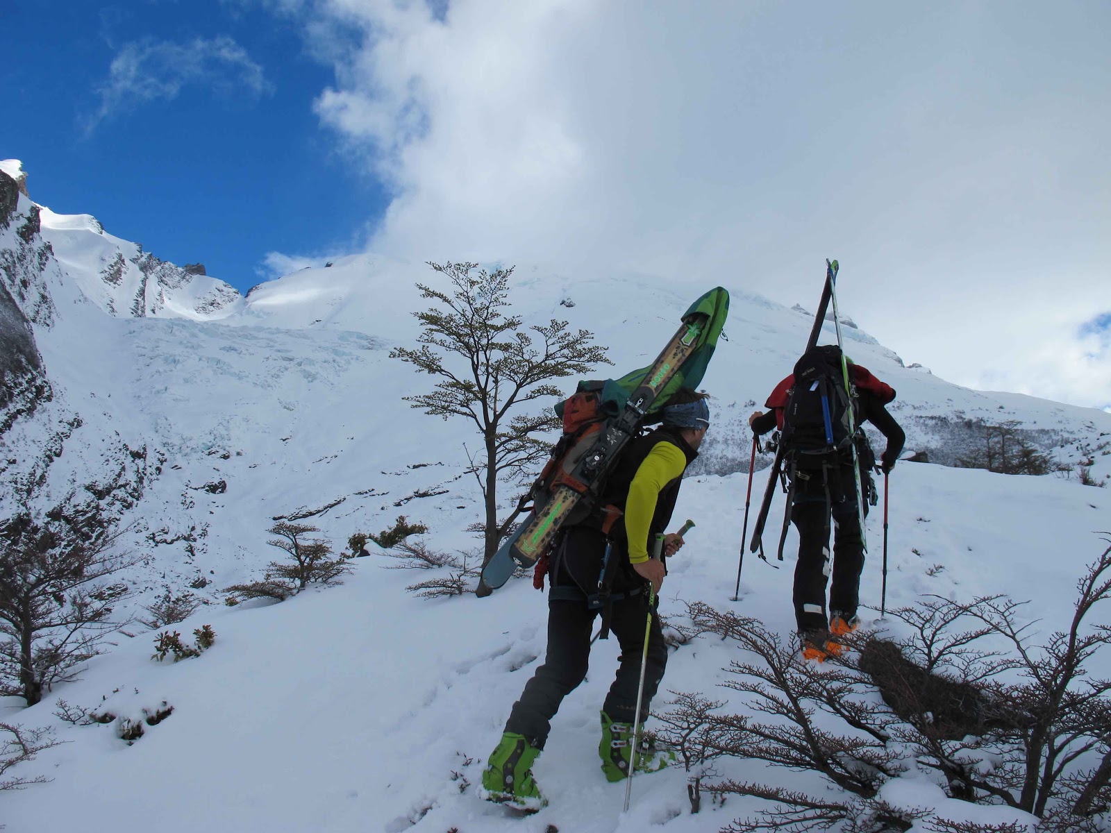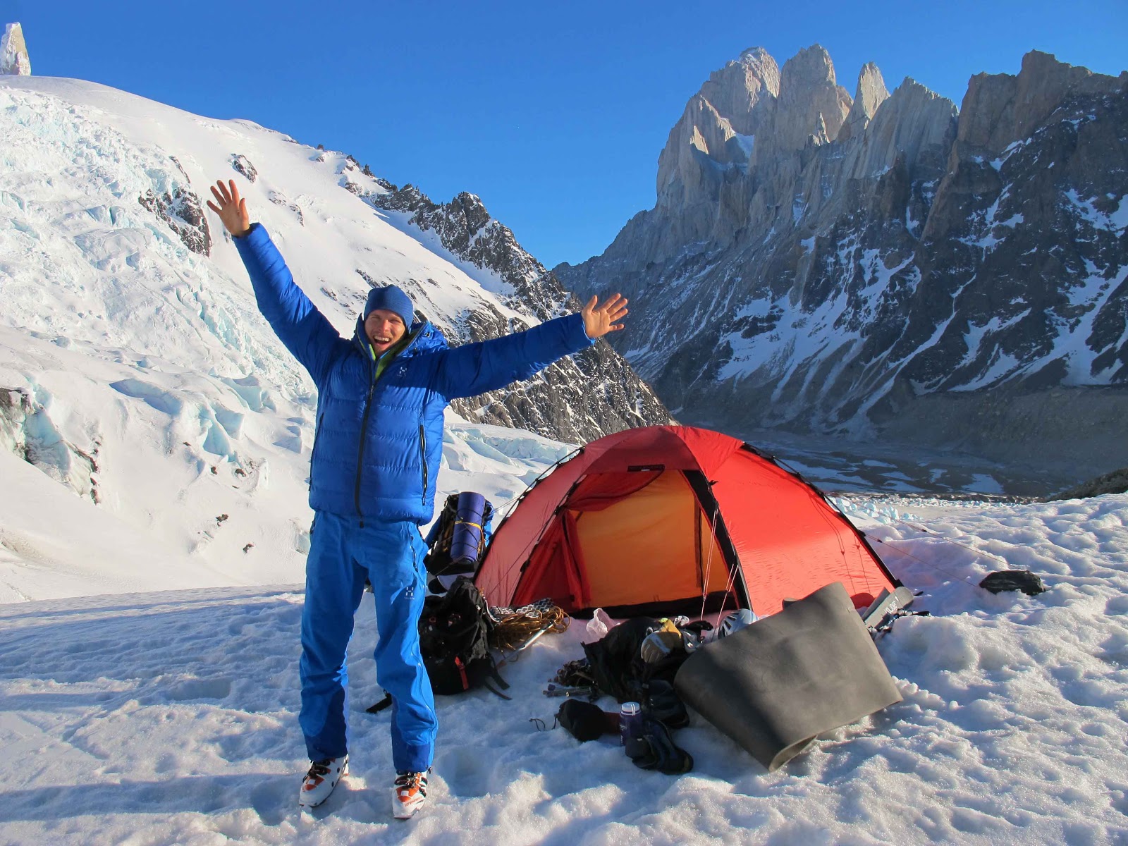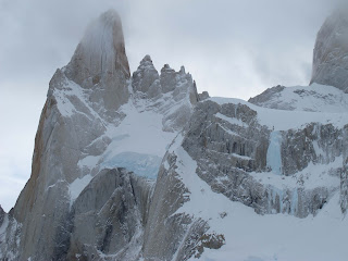 Myself and friend and film maker Bjarne Salén are now in El Chaltén, Argentina, a village situated next to the legendary mountains of Cerro Torre and Fitzroy. On our first try three days ago, we walked in to the Torre valley to check out two of our potential objectives. After seven hours of walking with extremely heavy packs we arrived at the glacier. We put up our tent and woke up to a beautiful day. But looking at the lines from below we realized the approaches to two of the lines we wanted to ski went straight through a massive active serac landscape. The other lines did not have as much snow on them as we would have hoped, and looked like the north face of Aiguille du Plan in Chamonix where the actual ski run is in a labyrinth of seracs. The small and easy lines seemed fine, but we felt like we rather walk back to be ready for the good stuff when we get the chance, than put our time in to things without real attraction.