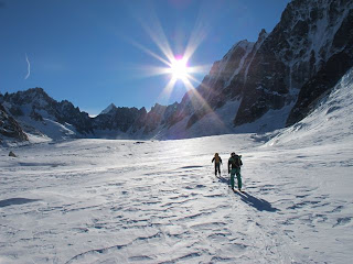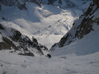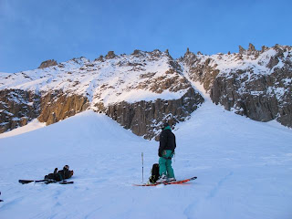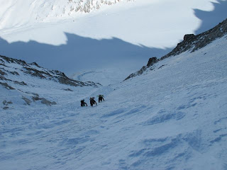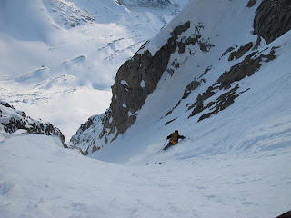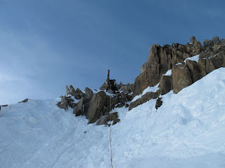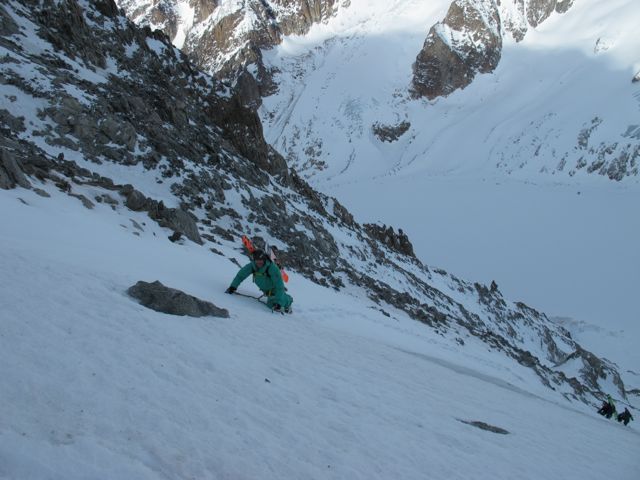 To get past, or at least minimizing the lottery we roped up and put a couple of bomber ice screws all the way to the ridge and did the traverse on running belays to the start of the real skiing.